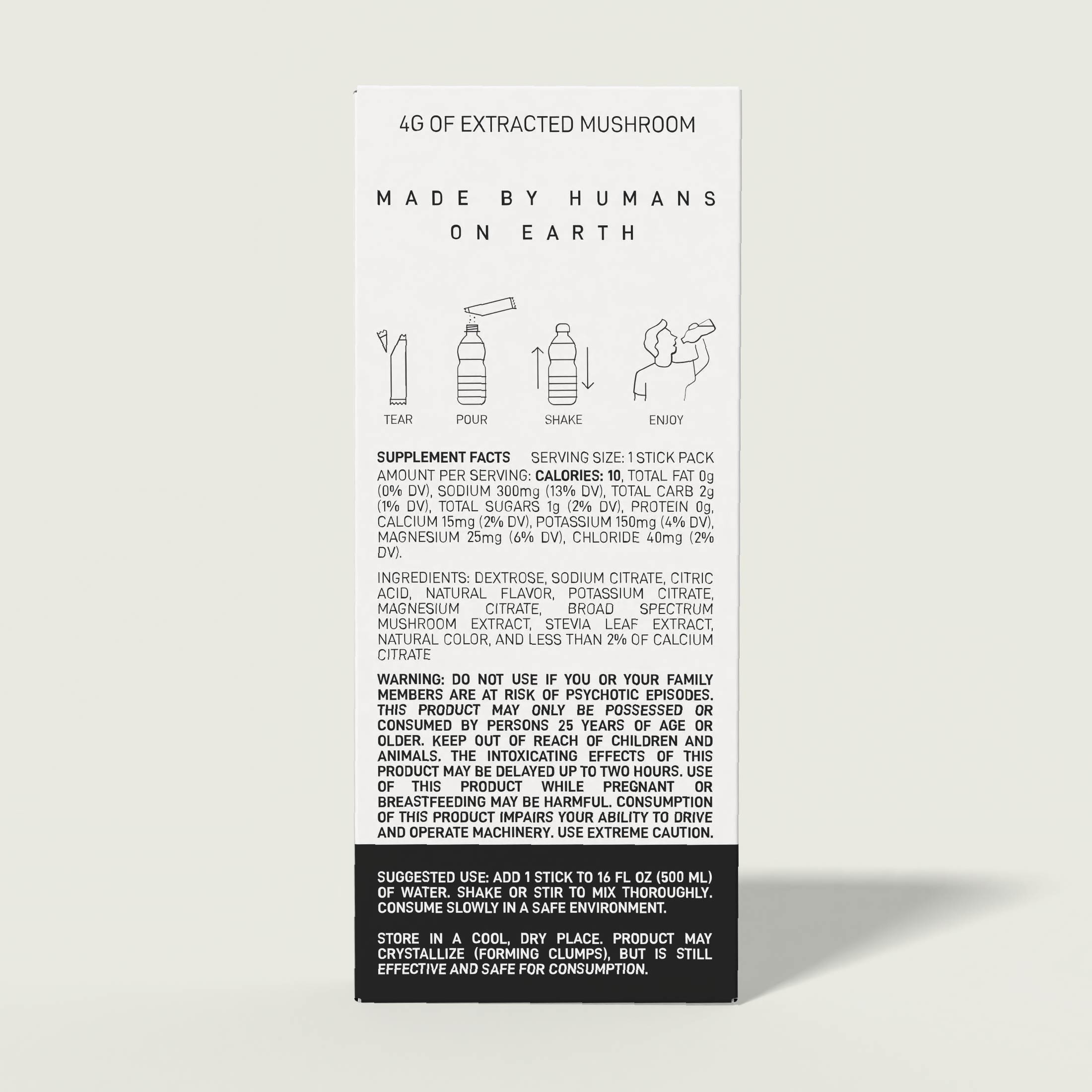 Ingredients: Dextrose, Sodium Citrate, Citric Acid, Natural Flavor, Potassium Citrate, Magnesium Citrate, Broad Spectrum Mushroom Extract, Stevia Leaf Extract, Natural Color, And Less Than 2% Of Calcium Citrate, Sea Salt